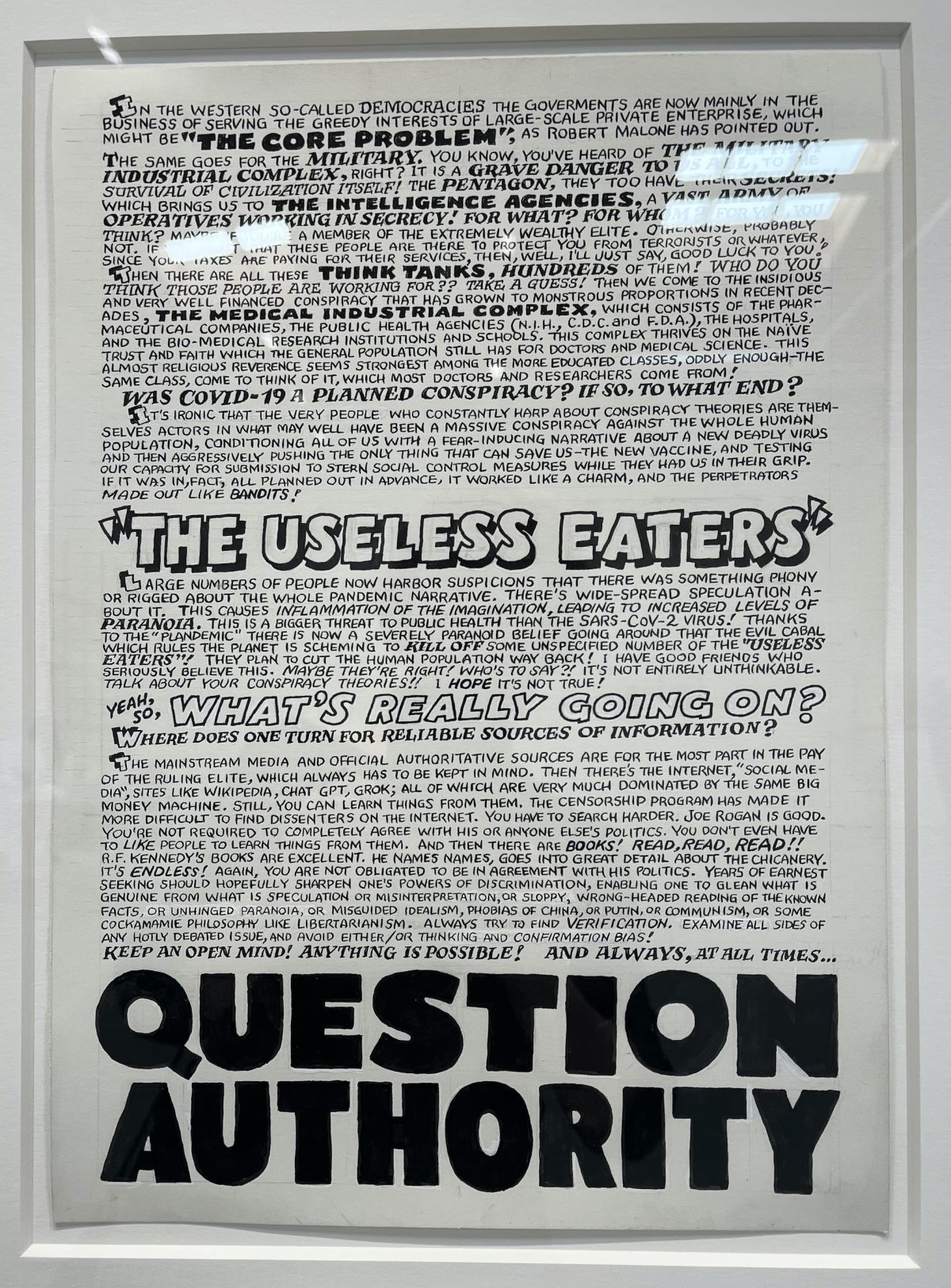 Many of Crumb’s personality traits don’t exactly match up: He’s liberal-minded but against vaccines; self-doubting but confident; a monogamist with a wandering eye. He is a mixed-up guy and is not afraid to put it all on display — perhaps for his own catharsis. In this new series he mainly concentrates on his paranoia with the vaccine and the political overseers, not trusting anyone. Two panels of “Conspiracy Theories!” (2025) are just text, spelling out the dire situation of today’s political climate. It’s difficult to get through the dense text, but a few gems stand out: “Large numbers of people now harbor suspicions that there was something phony or rigged about the whole pandemic narrative,” “What’s really going on?,” “Where does one turn for reliable sources of information,” and in big black block lettering, “QUESTION AUTHORITY.” One could easily walk away from this exhibition with a sense of doom.