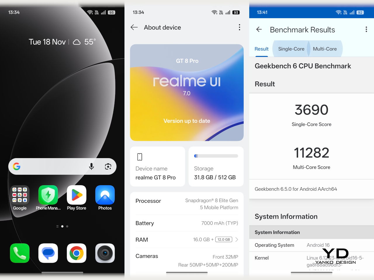 Inside, the GT8 Pro is powered by the latest Snapdragon flagship chipset, the Snapdragon 8 Elite Gen 5, and that choice sets the tone for the entire performance story. This chip is designed for demanding multitasking, heavy gaming, and advanced AI features, and the phone leans into that with confidence. Realme pairs the main chipset with either 12 GB or 16 GB of RAM, along with 256 GB or 512 GB of fast UFS 4.1 storage, depending on the configuration. On the software side, Android 16 with realme UI 7 sits on top, bringing a colorful, feature-rich interface that still keeps most interactions intuitive and approachable.