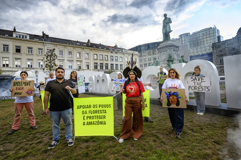 Campaigners protest outside the EU to demand the implementation of the EUDR and against rollback of the EU’s environmental agenda. Philip Reynears / Philip Reynaers/ Greenpeace