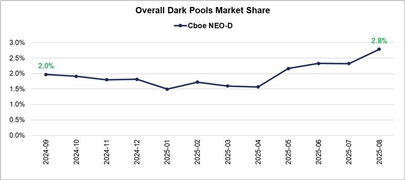August HighlightsCanadian volumes remain strong at 1.18 billion Average Daily Volume (ADV), down 0.15% month-over-month but up 27% year-over-yearCboe Canada market share is stable at 12.6%NEO-D market share increased to approximately 0.2% overall market share and 2.8% of all dark poolsNEO-D is the only dark marketplace in Canada that provides an active rebate to retail with price improvement.NEO-D has a strict price-time priority model with no broker preferencing.NEO-D active volume is over 56% retail.