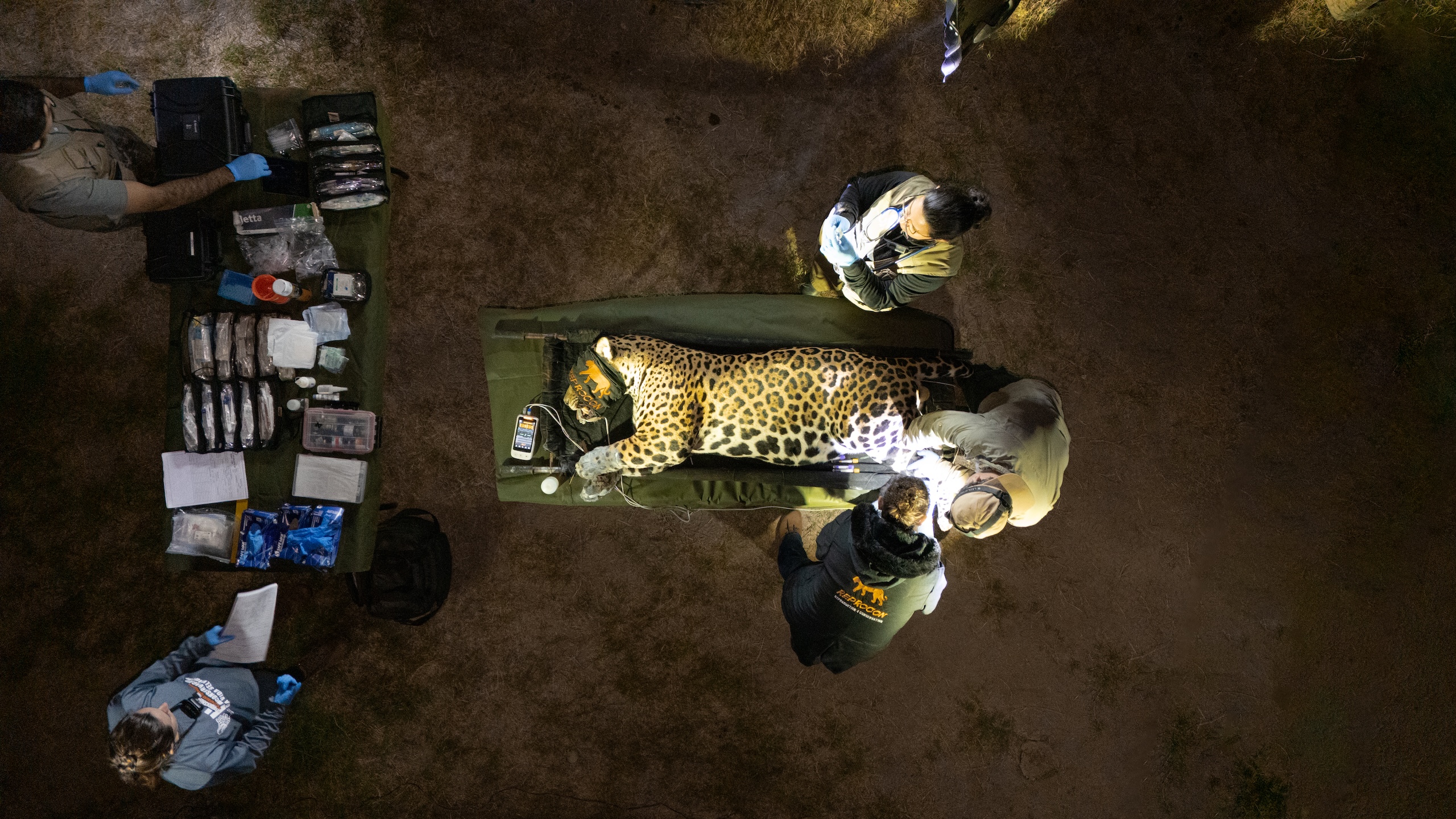 Reprocon researchers collect genetic and biological material from the jaguar named Leonço for later use in assisted reproduction methods for the species. Image by Gustavo Fonseca.