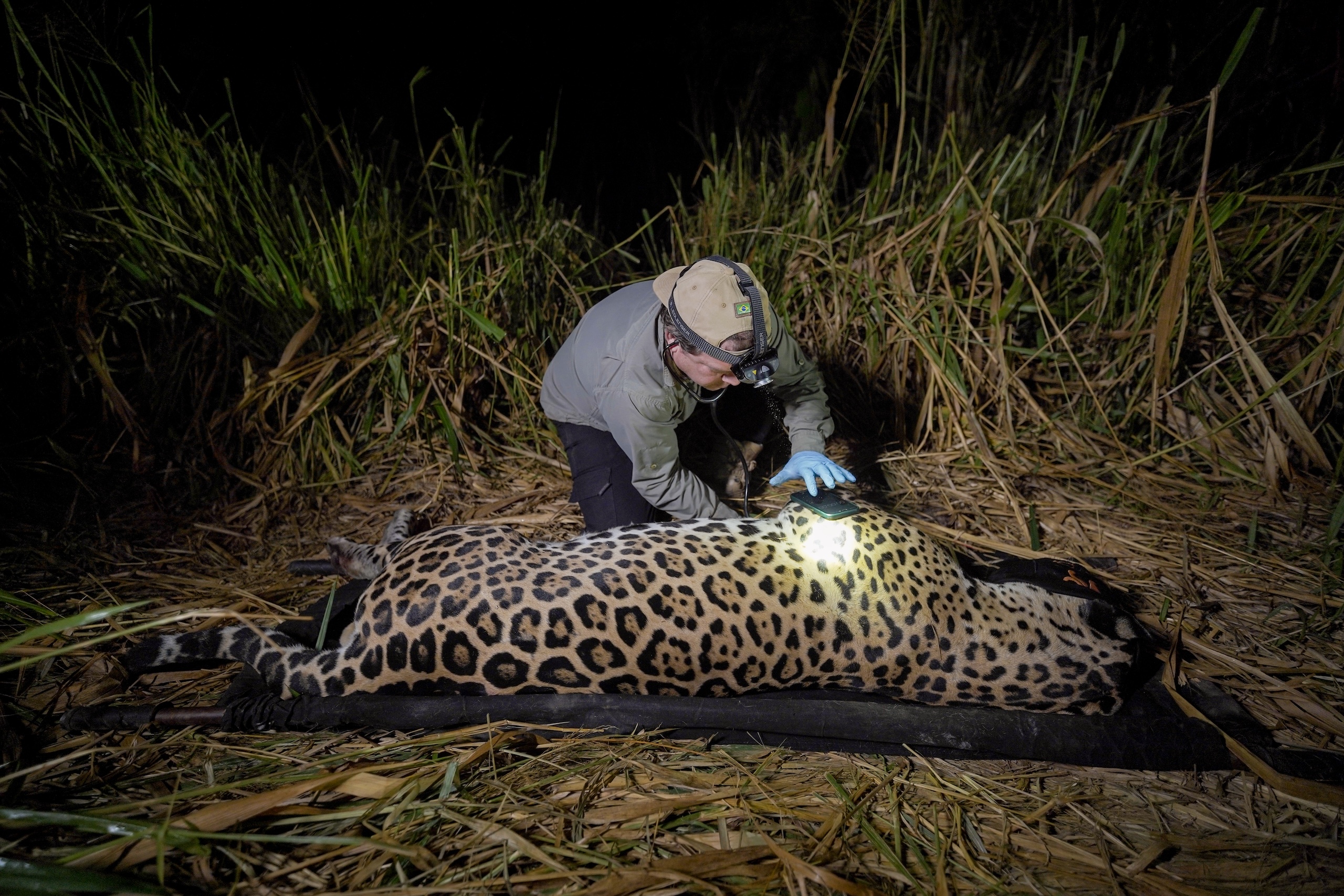 Over the next two hours, the researchers carried out an array of physical measurements and collected samples of fur, ticks, semen, blood and even a piece of the animal’s ear. At the end of the procedure, an anesthesia reverser was applied and the jaguar — which, by that point, had received the name Leonço — was placed a distance away on the grass at the other side of a fence. After two minutes, he began to move and staggered off into the dark forest. Leonço is estimated to be eight years old. Males normally live approximately 13 years in the wild — less than females because of the fights they engage in with other males, and Leonço has a few marks on his face to prove it.