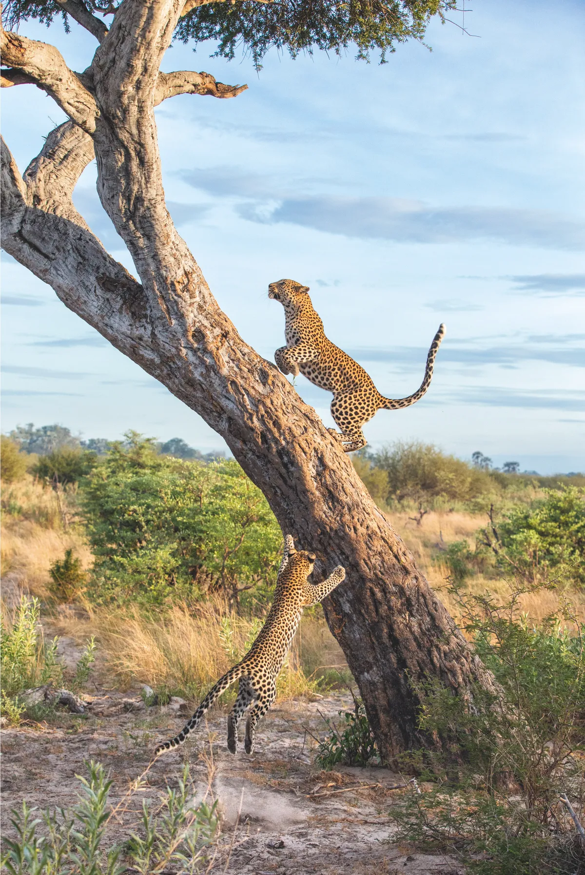 Of all the big cats, leopards are the most adept at climbing, with males famously able to drag carcasses three times their own weight up into the branches. Here, one of Camp Female’s cubs chases her up a steep, sheer trunk. Suzi Eszterhas