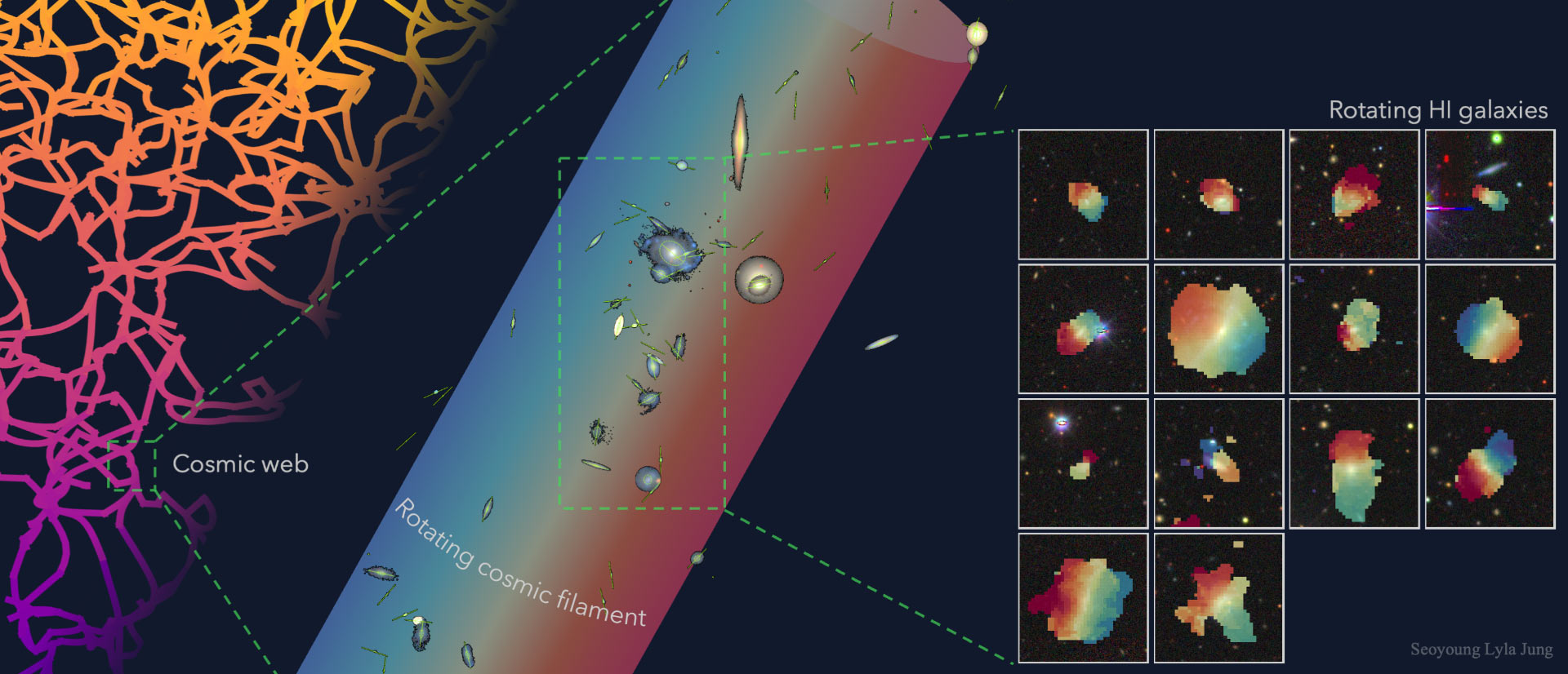 A figure illustrating the rotation of neutral hydrogen (right) in galaxies residing in an extended filament (middle), where the galaxies exhibit a coherent bulk rotational motion tracing the large-scale cosmic web (left). Image credit: Lyla Jung.