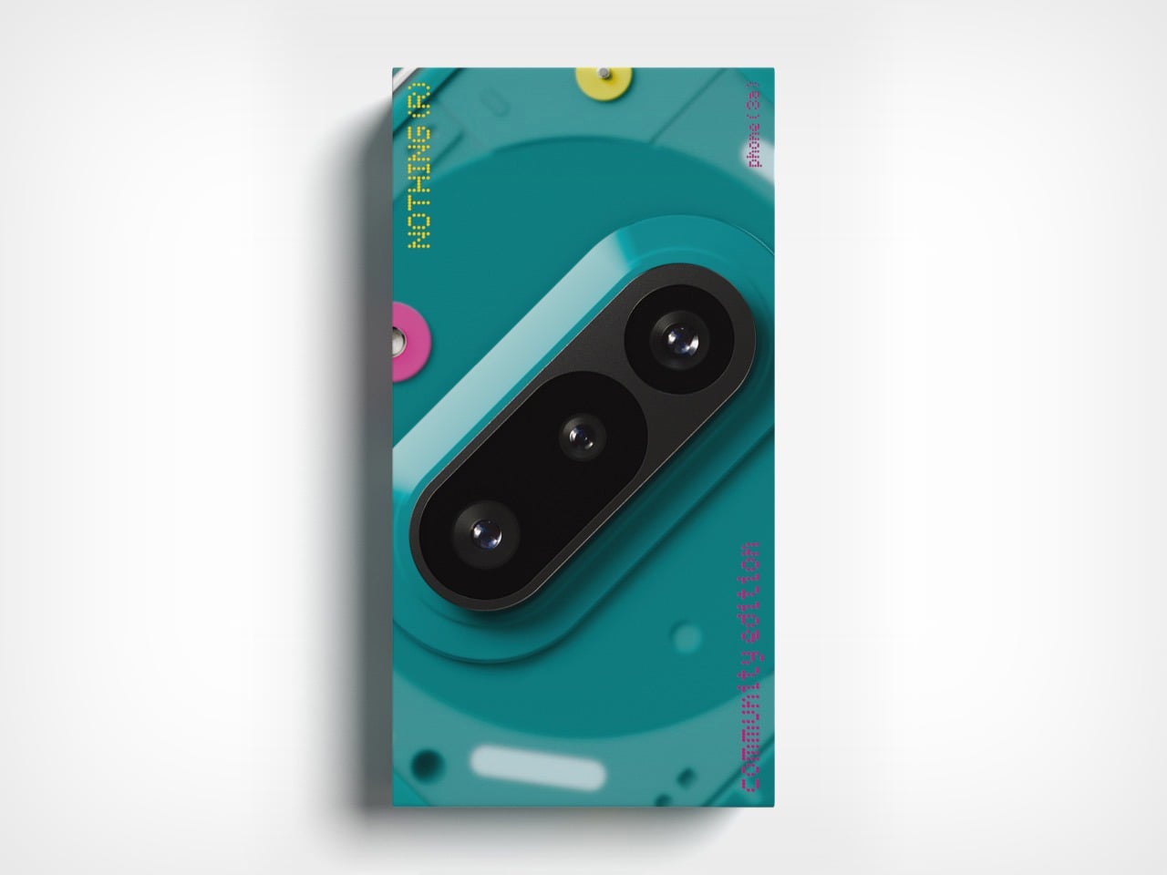 The aesthetic is where the Community Edition truly sets itself apart. The translucent teal back, designed by winner Emre Kayganacl, reveals internal components arranged as clean geometric layers. This gives the rear a deliberate, compositional quality rather than a raw, tech-exposed look. The horizontal camera module sits perfectly centered, with Nothing’s signature glyph light arcs wrapping around it to signal notifications. Small, scattered circles of yellow and magenta add playful contrast, giving the phone a character reminiscent of a limited-edition handheld console without feeling like a simple throwback.