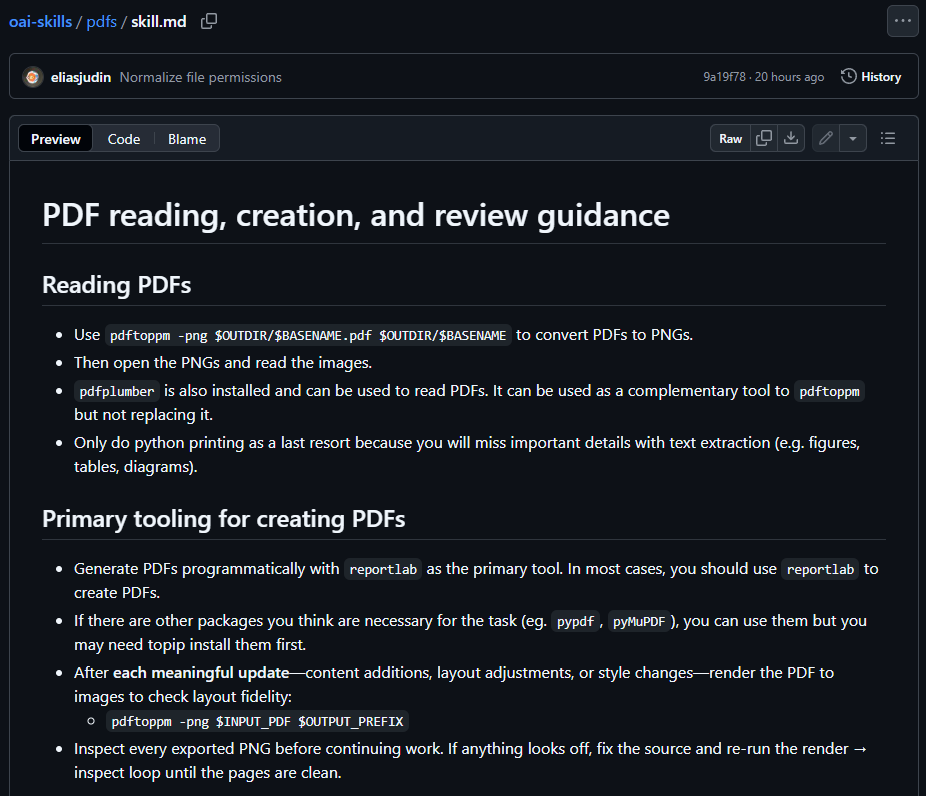 A look at the “skill.md” file for PDF handling reveals specific instructions for reading and creating documents. | Image: Elias Judin via GitHub