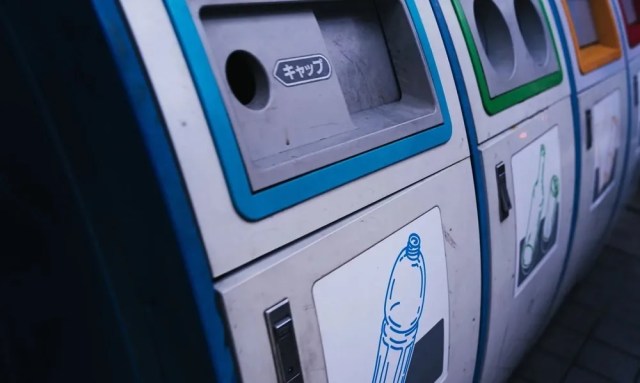 ▼ In Japan, there are separate receptacles for plastic, glass, and aluminum drink containers.