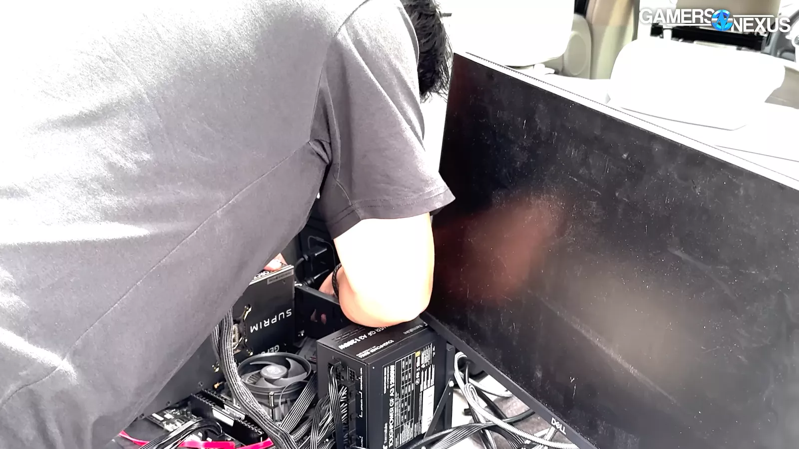 The Plug, as we call him, has an ATX test bench, motherboard, simple downdraft cooler, power supply, obviously a CPU, RAM, and an SSD, and gigantic battery in the trunk of his Prius. He also has at least one spare license plate in his trunk in addition to the one on the back of his car. We’re not sure why, but it’s better not to ask.