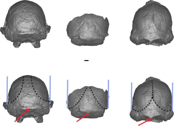 3D models of the backs of the skulls of a known A. africanus, MLD 1, and Little Foot. Credit: American Journal of Biological Anthropology, 2025.