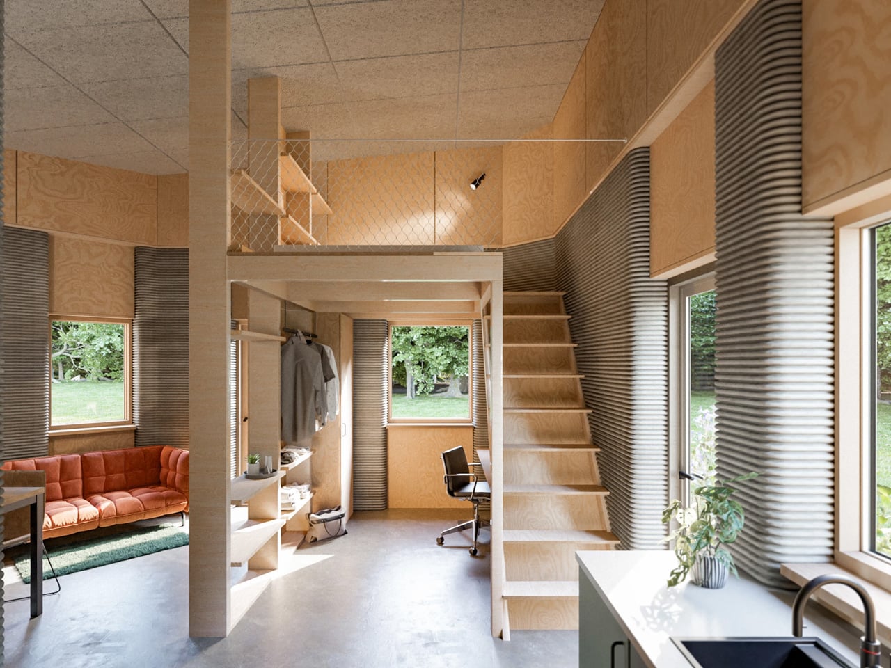 SAGA Space Architects approached this project with a clear vision: create genuine homes, not just proof-of-concept structures. Each apartment spans 39 to 50 square meters and includes everything students need—kitchen, study area, lounge, bathroom, and double bed. Large roof windows punctuate the slanted ceilings, flooding the compact spaces with natural light and creating an atmosphere of openness despite the modest footprint. The architects understood that 3D-printed concrete walls, while structurally impressive, could feel cold and industrial. They deliberately softened this with warm timber finishes and modern glass elements, creating spaces that feel inviting rather than experimental, comfortable rather than clinical.