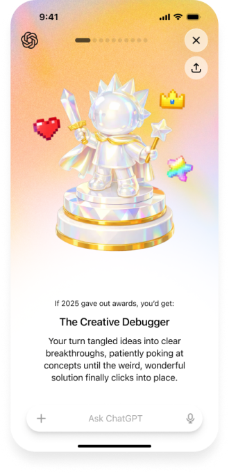 Similar to other annual reviews offered by consumer apps, “Your Year with ChatGPT” takes inspiration from the popular year-end look back, Spotify Wrapped. Like Spotify’s feature, OpenAI uses catchy graphics and personalizes the experience to the individual by giving out “awards” based on how you’ve used ChatGPT throughout the year.