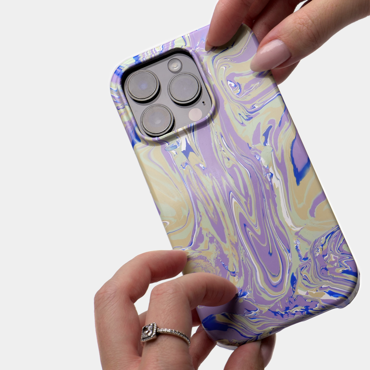 Each case is pressed from mixed plastic, creating a marbled pattern that cannot be repeated. No two cases are the same, which makes the randomness part of the appeal rather than a defect. Colourways like Panther or pastel mixes become loose guidelines rather than exact prints, and the result is a one-of-one object that looks like a tiny slab of recycled terrazzo wrapped around your phone, and no one else has the exact pattern.