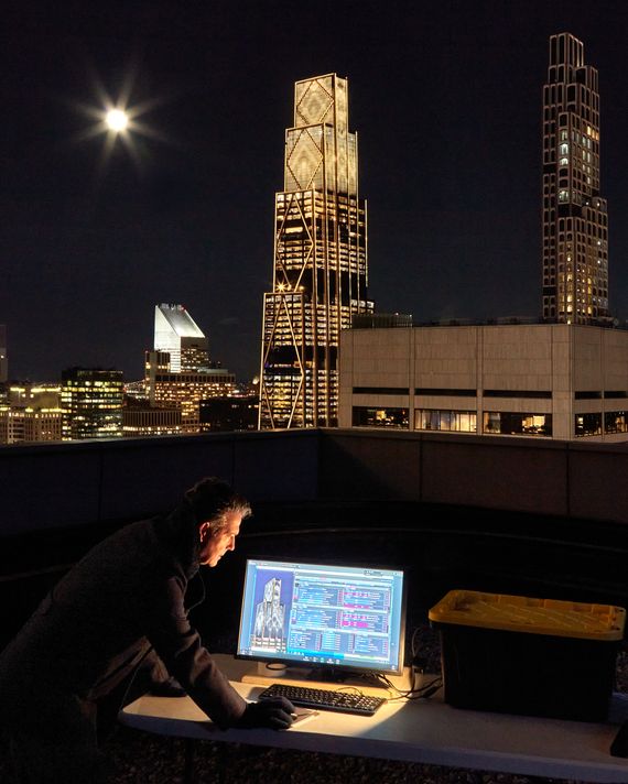 Leo Villareal’s latest artwork is so big that, in order to step back from the metaphorical easel and take it all in, he needs to be ten blocks away and 42 stories up. Atop a tower near Bryant Park, reachable by two service-elevator rides and down a concrete hallway, his temporary workspace is, apart from his own presence, pretty artless. It’s just a computer and monitor on a plastic folding table and a couple of office chairs. A steel door, propped open, leads to the building’s gravel-surfaced roof. From this chilly vantage point, Villareal can see his monitor and also the top half of 270 Park Avenue, the new JPMorgan Chase tower. At dusk, he takes the controls.