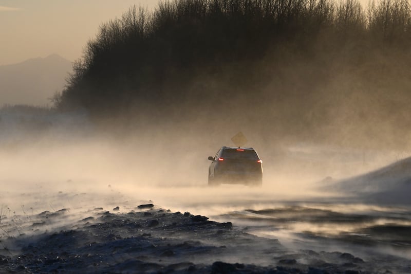A gust of wind kicks up fresh snow as a vehicle travels on Point Woronzof Drive in Anchorage on Sunday, Dec. 28, 2025. (Bill Roth / ADN)