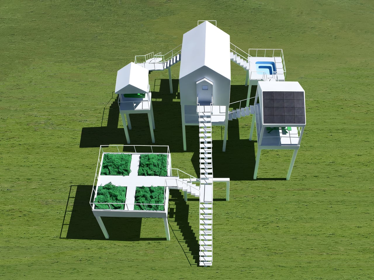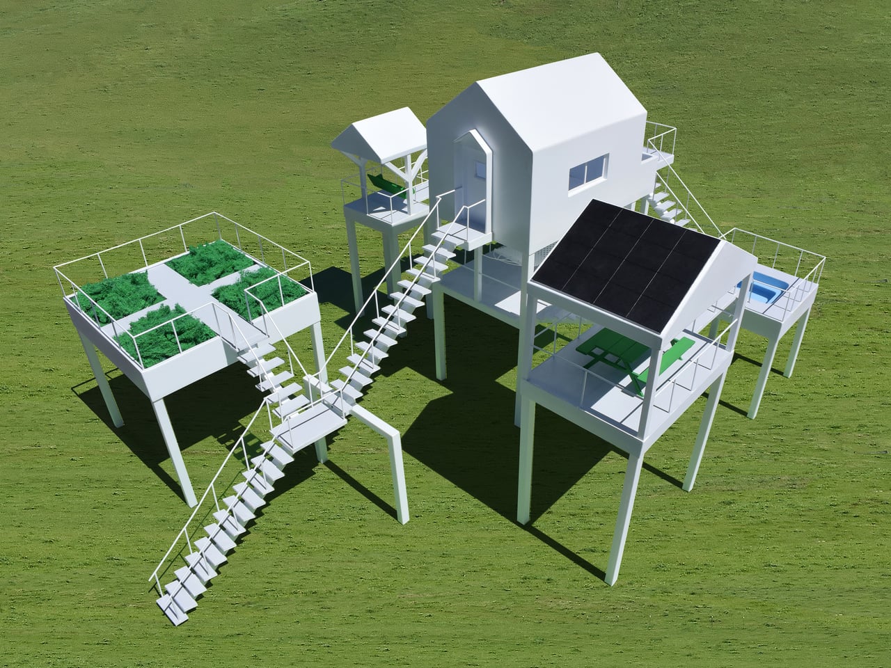 The central house is a compact volume with sleeping space, a desk, a toilet, a shower, and a small food-preparation area. Around it, the elevated amenities include a garden, a hot tub, a picnic pavilion, a porch-swing pavilion, a hammock platform, and a solar-cell array for electricity. All sit on their own stilts at different heights, connected to the house and to each other by a network of stairs, two of which descend to the ground.