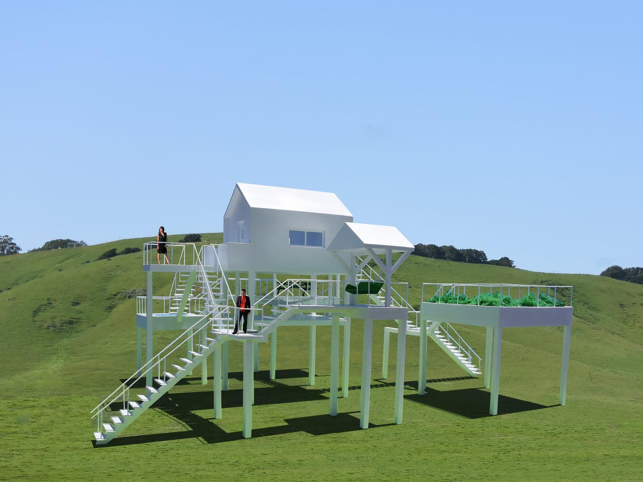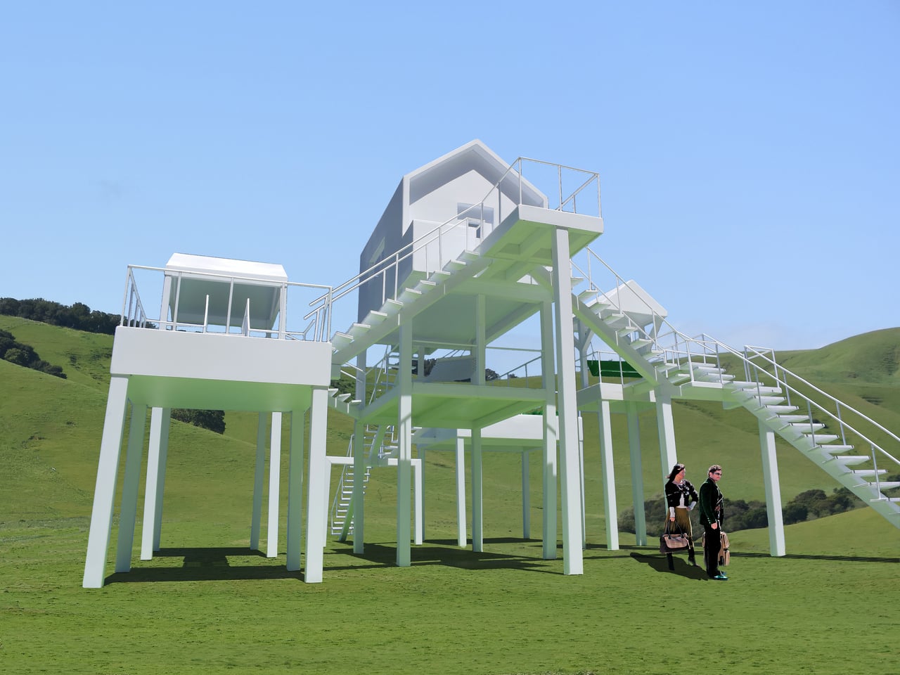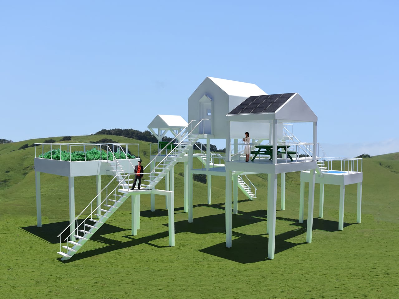 Jantzen describes the Elevated Leisure Habitat as basically a large interactive sculpture that explores new and exciting ways in which to have fun. It sits somewhere between house, artwork, and playground, using familiar icons and a simple structural language to reframe what a holiday stay could be. Instead of retreating into a single enclosed volume, guests would inhabit a small network of outdoor rooms in the sky, climbing and crossing between platforms as if moving through a three-dimensional diagram of leisure itself.