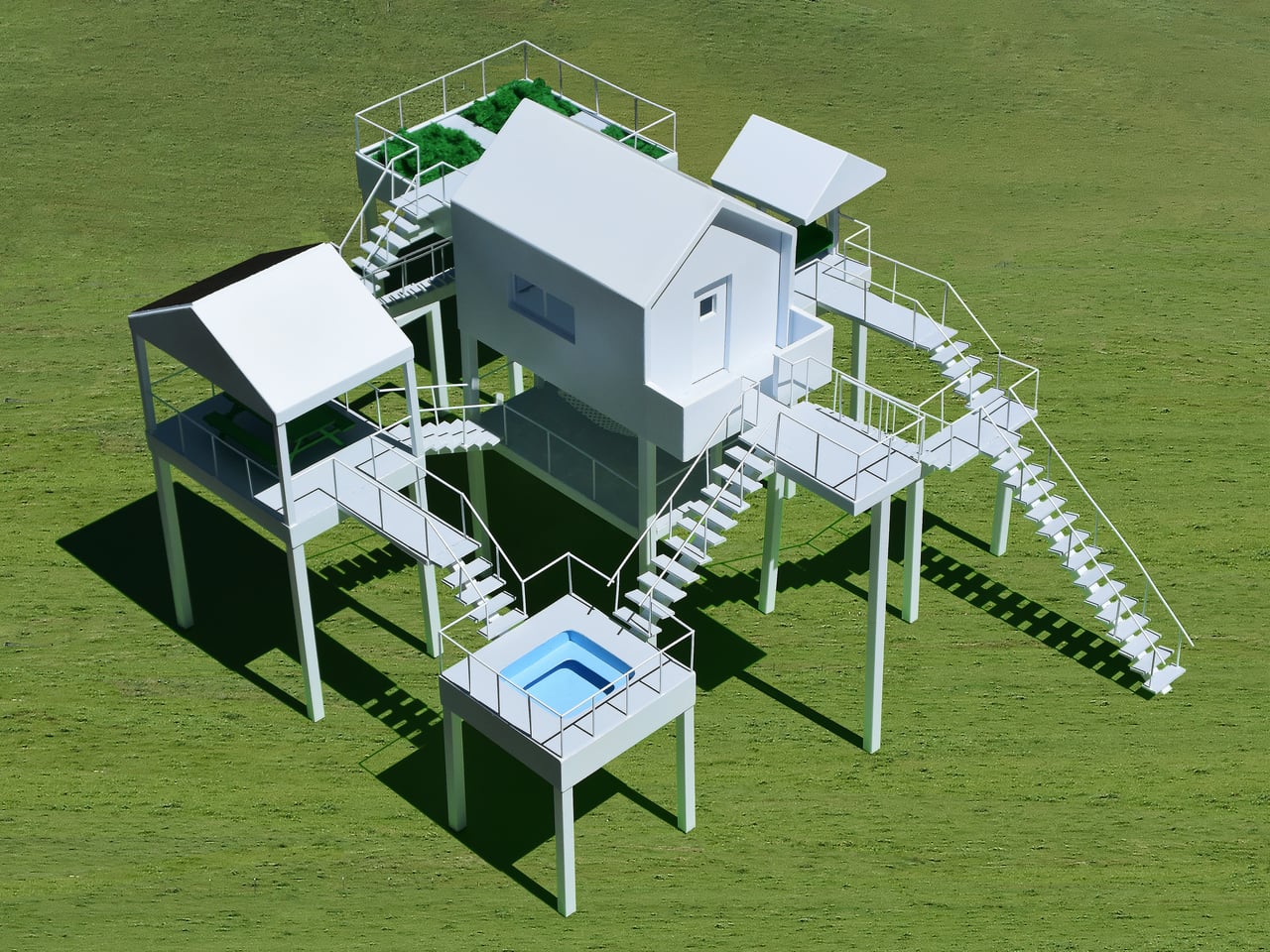 The Elevated Leisure Habitat is a functional art structure meant to be rented as a very special vacation place. This first version is designed for two people and consists of a small central house surrounded by a series of elevated platforms, each dedicated to a single leisure activity. Instead of one building with a yard, you get a loose constellation of outdoor rooms in the sky, linked by stairs and landings.