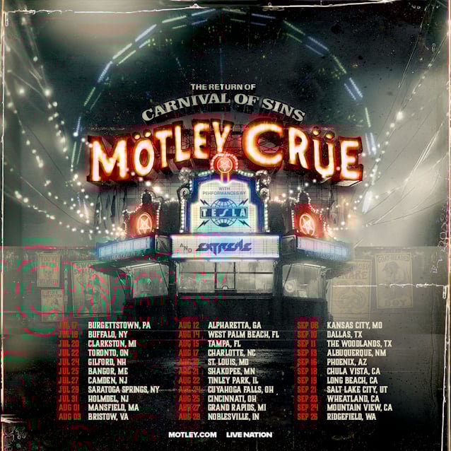 In a new interview with Jon Smith of the 103.5 The Arrow radio station, MÖTLEY CRÜE bassist Nikki Sixx spoke about the band’s upcoming “The Return Of Carnival Of Sins” tour celebrating the 20th anniversary of CRÜE’s groundbreaking 2005-2006 “Carnival Of Sins” tour and the 45th anniversary of the band. The 33-city Live Nation-produced trek will kick off on July 17, 2026 in Burgettstown, Pennsylvania at the Pavilion at Star Lake and will feature support acts EXTREME and TESLA. Nikki said (as transcribed by BLABBERMOUTH.NET): “Two of our biggest tours was the ‘Dr. Feelgood’ tour and the ‘Carnival Of Sins’ tour 20 years ago. And back then, [we had] probably 20 semi-trucks full of gear — hard goods, as they call ’em — [with] all kinds of stuff. And now, with the advancement of technology, we can just take the fans on a crazy journey. And I just think it’s gonna be the next level. ‘Cause the first one was a lot of people’s favorite tour, so we have a lot to live up to.”