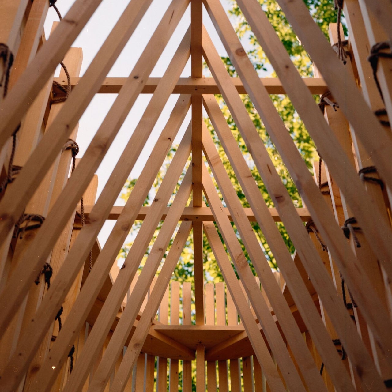 The sandwich-structure ribs are cut from regular boards, which keeps the whole thing light enough to be temporary but sturdy enough to handle weather and people climbing on it. Because let’s be honest, people are absolutely climbing on it. Six porticoes break up the interior corridor, the plank walls curve into proper half-hulls at each end, and they dropped four local stones inside as ballast. Another stone anchors the bow. These aren’t decorative choices, they’re the structural and conceptual glue holding the nautical metaphor together.
