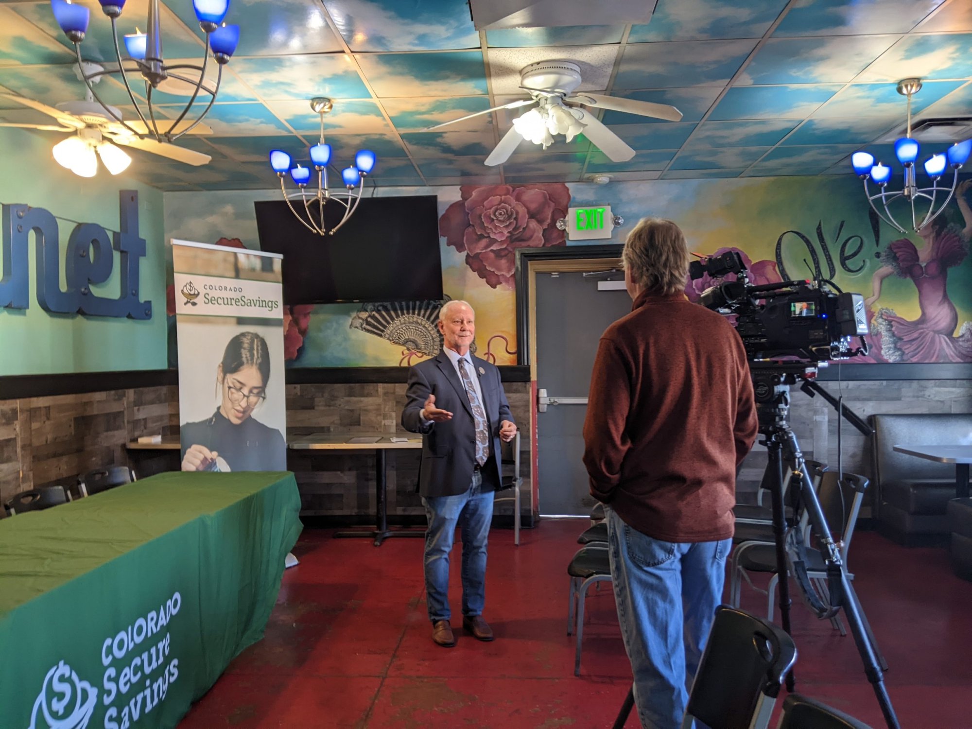 At Blue Bonnet Cafe in Denver on Dec. 10, 2024, Colorado State Treasurer Dave Young talks about the state’s SecureSavings plan, which offers a Roth retirement plan for workers who don’t have one.(Tamara Chuang, The Colorado Sun)]