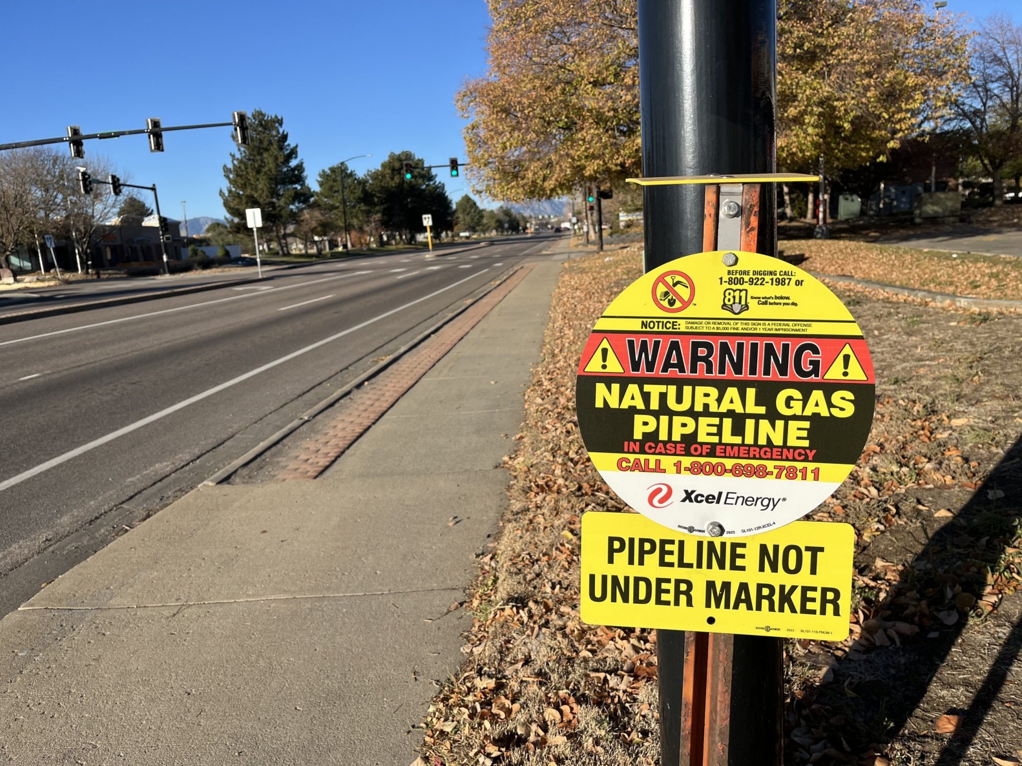An Xcel Energy natural gas pipeline marker in Boulder County. (Dana Coffield, The Colorado Sun)