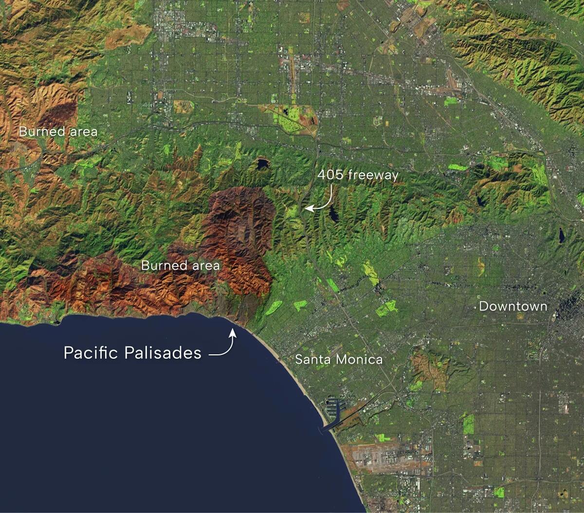 The charred areas stretch north and west of Pacific Palisades toward Malibu, where land previously burned by the December 2024 Franklin fire is also visible along the coast.