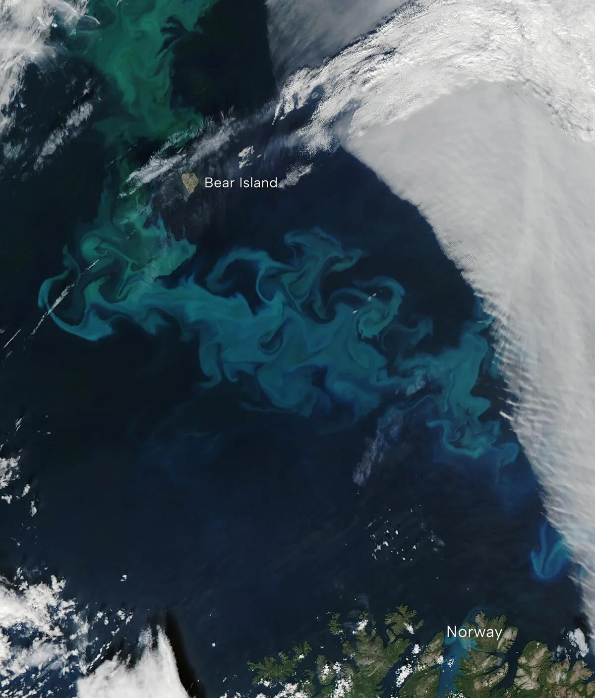 This Aqua MODIS image from August 5, 2025, reveals a massive phytoplankton bloom swirling through the Barents Sea near Norway’s Bear Island.