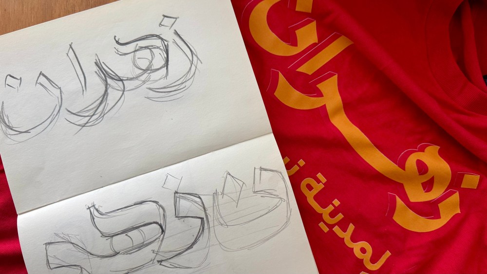The piece isn’t a cursive flow but a drawn, illustrated form. A drop shadow gives it a sculptural energy, a hint of movement borrowed from street lettering traditions. “It sits in the middle of non‑calligraphic Arabic letterforms,” Morcos says, “but is still heavily inspired by the roots of Arabic calligraphy; drawn with the affectations of a drop shadow and a clear construction, but still expressive with these pointy ends.”