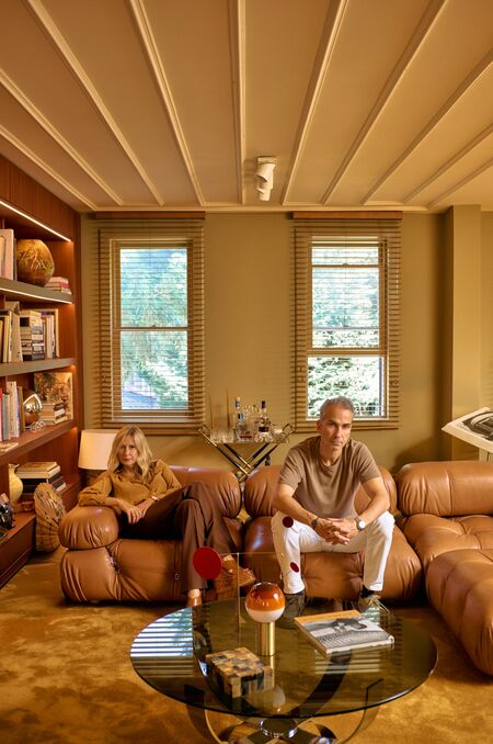 The sandy-hued tones, which hint at 1970s West Coast interiors, wash the dwelling with amber shades in furniture and carpeting. An Alexander Calder mobile rests on the coffee table, not so far from a ceramic sculpture by their close friend and collaborator José Parlá.