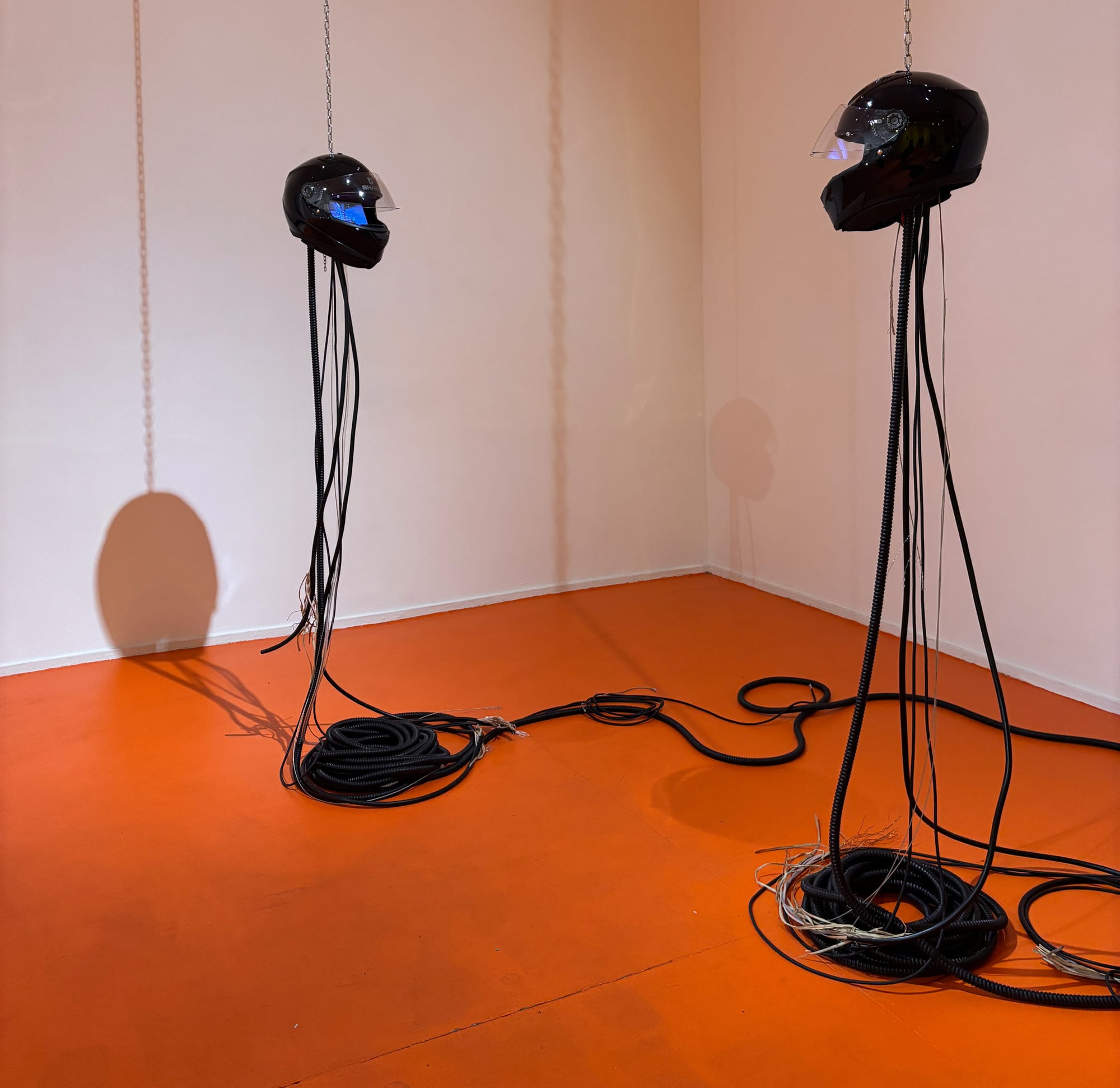 Installation view of Ayoung Kim, “Ghost Dancers A” (2022), helmets, video, tablets, wire, corrugated tube, and metal chain