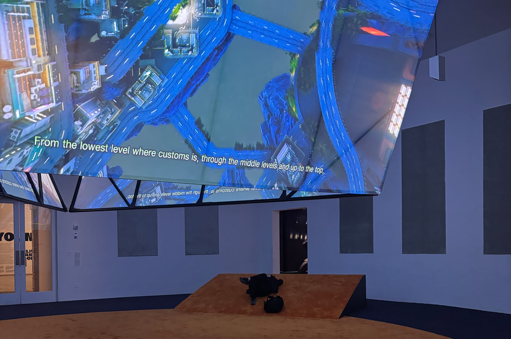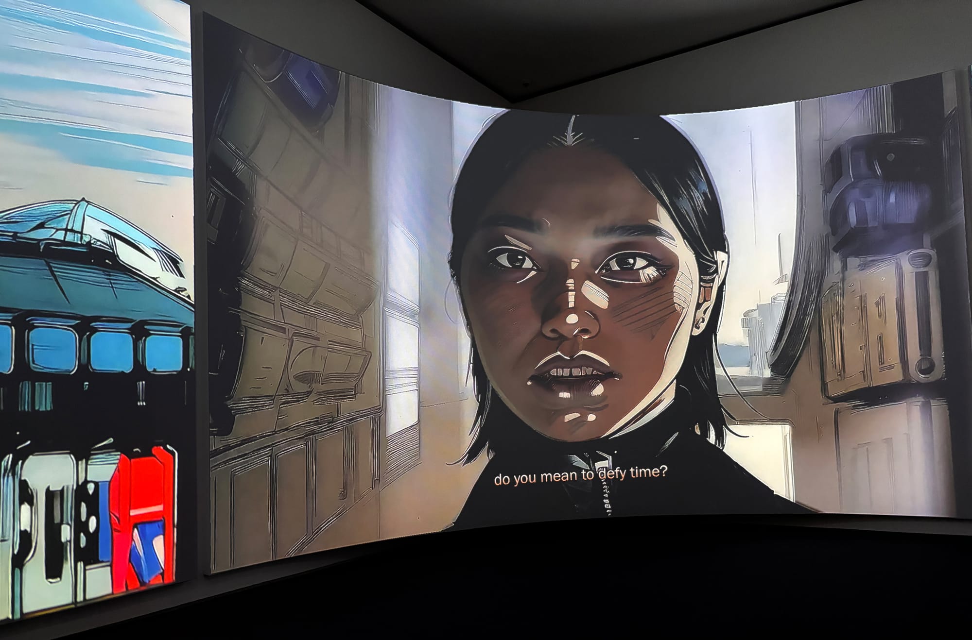 Installation view of Ayoung Kim, “Delivery Dancer’s Arc: 0º Receiver” (2024), three-channel video