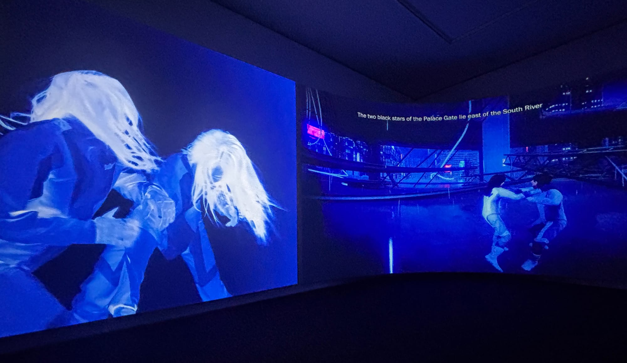 Across the hall, the next two parts — “Delivery Dancer’s Arc: Inverse” and Delivery Dancer’s Arc: 0º Receiver (both 2024) — expand the prequel’s question of invisibility and fugitivity. In the latter, Storm and Mo race across open desert — initially materialized only as a trail of dust, before emerging in full form across a three-channel screen that spans two walls. In this universe, Storm and Mo fight the Timekeepers’ imposition of the “absolute time,” which aims to foreclose any divergence from standardized existence. A ghostly voice hums a song whose title — “Song of the Sky Pacers” — and lyrics borrow from an ancient Chinese poem used for celestial navigation. Together, the voiceover and the score suggest temporal measurements closely aligned with nature: the awakening of frogs, the Eastern wind thawing frozen soil, among others. Meanwhile, Mo and Storm’s bodies interlock and untangle across three channels, oscillating between acts of tenderness and aggression — an embrace, for instance, quickly gives way to strangling. The indeterminacy of their relationship mirrors divergent temporalities, all of which resist capitalism’s demand for standardization and optimization.