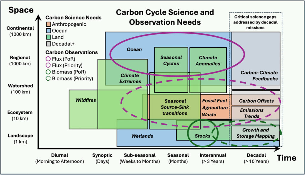 Diverse carbon cycle science needs span multiple time (x-axis) and space (y-axis) scales across land (green shading), ocean (blue shading), and fossil (orange shading) sectors. Science needs addressed by the current and planned carbon flux and biomass Earth Observation (EO) program of record (PoR; purple and green, respectively) are depicted by the solid circle. Key EO science gaps exist at 1–100 kilometer spatial scale spanning sub-seasonal impacts of climate extremes and wildfires, interannual change and biomass, long term changes in growth, storage, and emissions, and carbon-climate feedbacks and tipping points (grey shading). Future GHG and biomass observing systems (e.g., dashed circles) will provide important benefits to carbon management efforts. Credit: Parazoo et al. [2025], Figure 1
