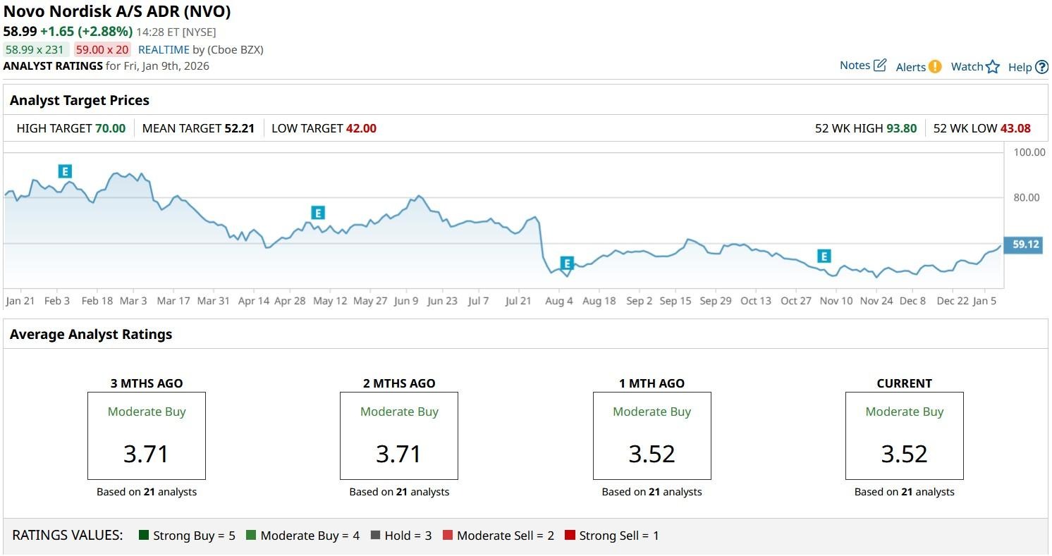 While Novo Nordisk stock did inch higher on Jan. 9, it remains down roughly 35% versus its 52-week high.