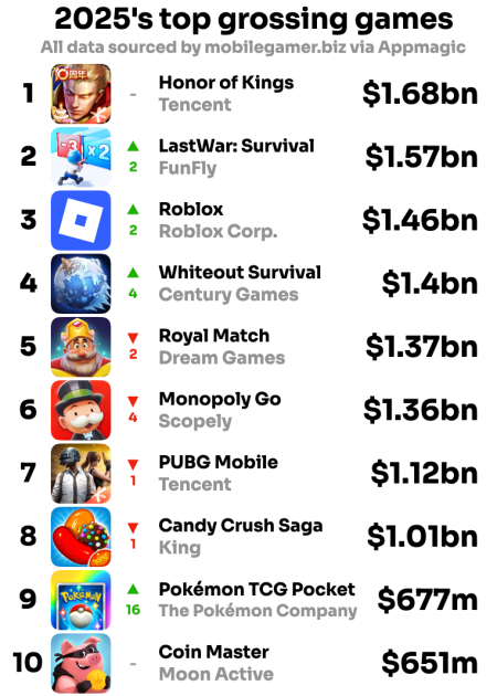 In years gone by, Honor of Kings topped these charts by some distance – but 2025 was different, with Last War running it close and six more games racking up over $1bn in 2025.