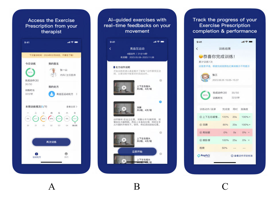 Figure 1. Interface demonstration of the “Rehabilitation Exercise Prescription” mobile app used for artificial intelligence (AI)–assisted telerehabilitation. A: main landing page of the app; B: interface showing a personalized exercise prescription generated for a participant; C: screen displayed upon completion of an exercise session, summarizing performance metrics. Assessment