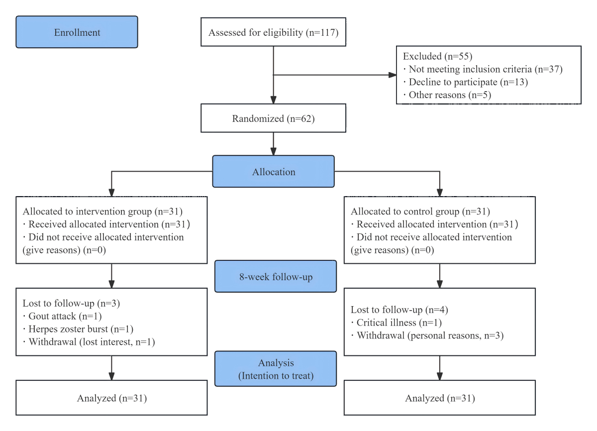 A total of 62 participants were included in this study, 31 each in the intervention and control groups. During the follow-up period, 2 people in the intervention group discontinued exercise intervention due to sudden illness, 1 person was unable to exercise for personal reasons, 1 person in the control group was unable to exercise for physical reasons, and 3 people were unable to adhere to exercise for personal reasons. Finally, according to the principle of intention-to-treat analysis, 31 people in the intervention group and 31 people in the control group were included ().