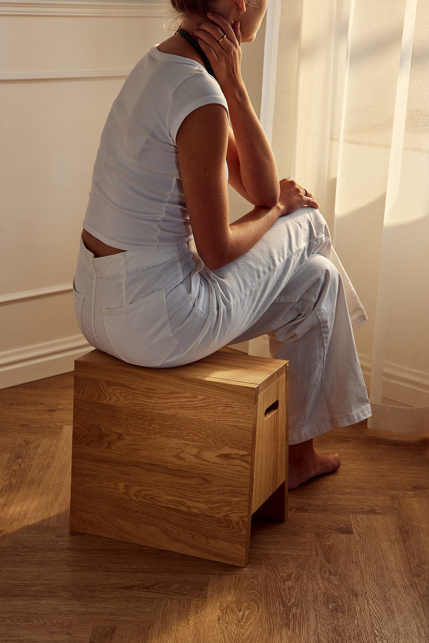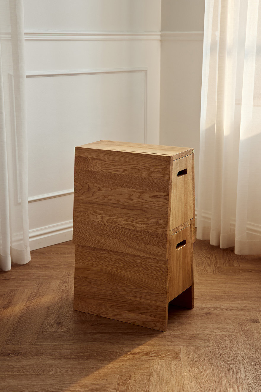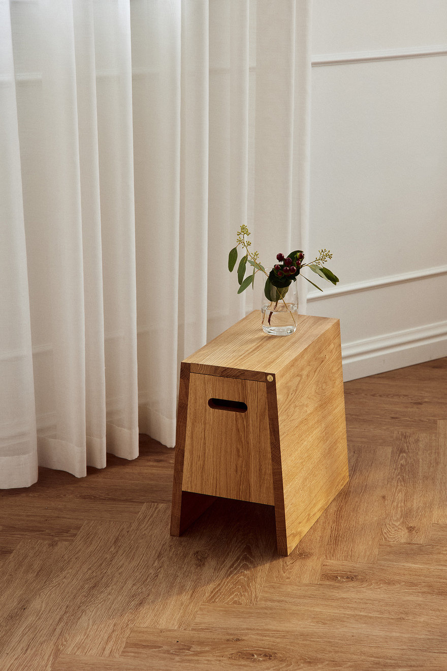Inspired by the form of a gymnast’s vault, her aim was to make a simple, elegant stool and storage piece.