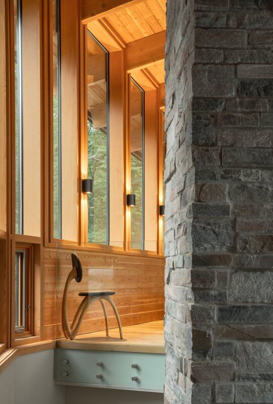 At the cottage’s center is a granite fireplace that spans both stories, and serves as a central axis from which the rest of the building pivots out from. (Adrian Ozimek)