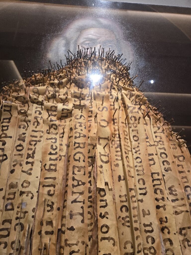 Arguably, the most moving piece I saw was titled “To Be Sold” by Titus Kaphar.  This piece relates to a headline from 1766, announcing the sale of six African slaves at Princeton University’s Maclean House.  Kaphar’s work includes nails, and strips of the advertisement, along the contours of a bust of Samuel Finley, president of the University from 1761 to 1766.