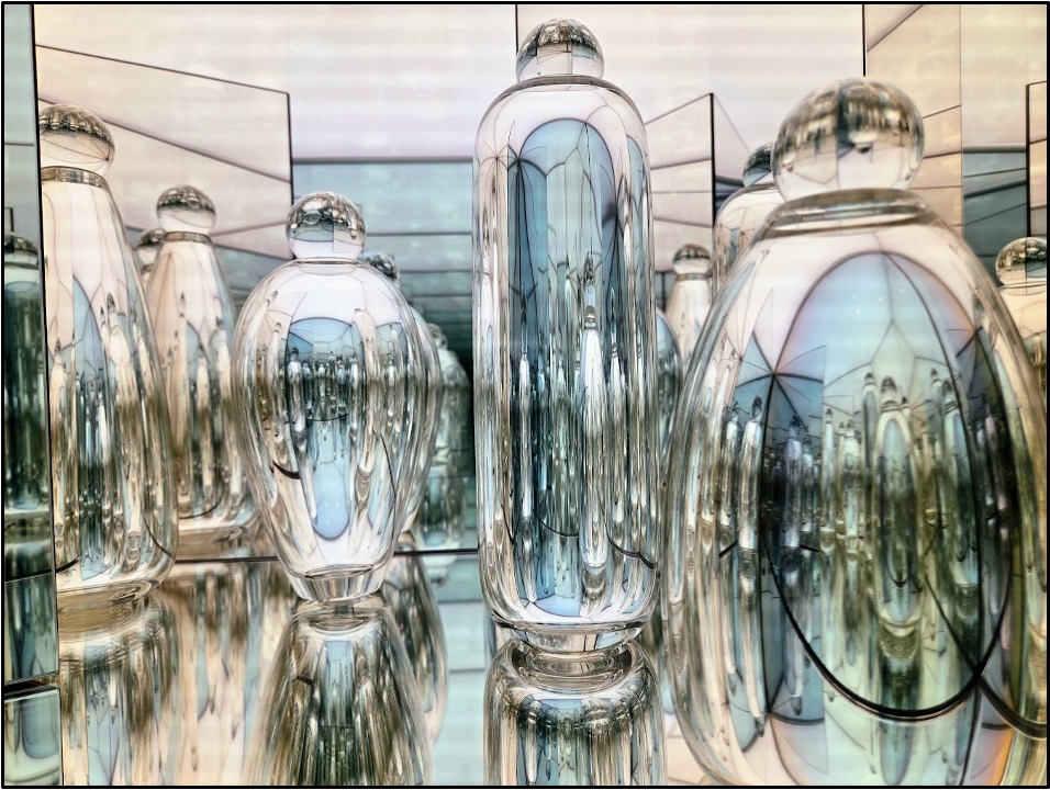 With 146,000 square feet, three stories, nine pavilions, 32 galleries, an education center, a restaurant, and more, the museum’s exterior esthetics don’t matter in the least.  As soon as we entered, I was drawn to “A Twilight Labryrinth (Alchemy)” by Josiah McElheny – a display of handblown glass vessels, inside a lighted, mirrored space.  The colors danced as you looked from different angles, and I stayed at that exhibit for a time, wondering if I could create something similar at home, but I highly doubt it.