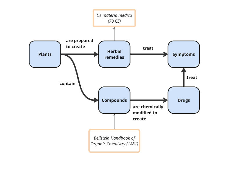 Once a class of things was defined, medicine immediately began naming and cataloging every instance it could find. Scientists are great at cataloging and defining instances of classes. De materia medica, the first pharmacopoeia, was completed in 70 CE. It was a book of about 600 plants and about 1000 medicines. When chemists began working with organic compounds in the lab, they created thousands of new molecules that needed to be cataloged. In response, the first volume of the Beilstein Handbook of Organic Chemistry was released in 1881. This handbook catalogued all known organic compounds, their reactions and properties, and grew to contain millions of entries.