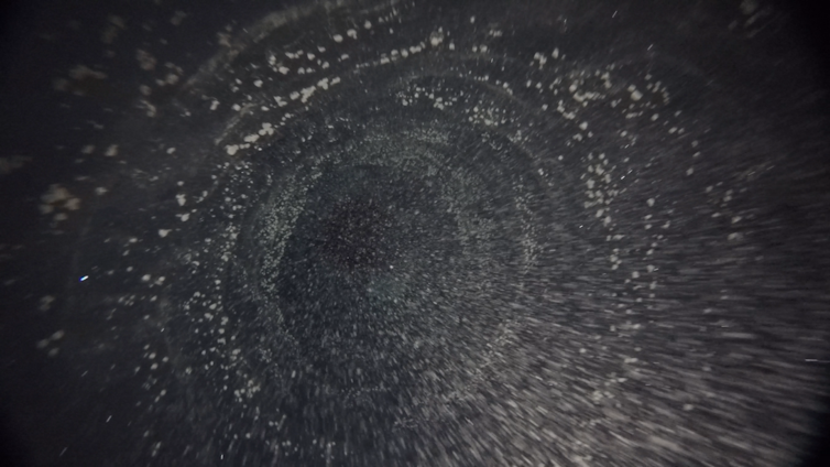 Looking downward in the borehole just before emerging into the ocean cavity. The white specks are sediment particles.