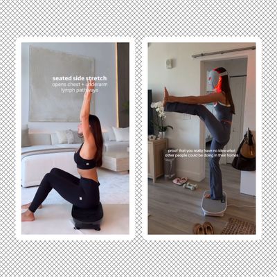 According to believers, vibration plates can help with everything from weight loss to stress. Gary Brecka — a self-proclaimed longevity expert who has worked with Kendall Jenner and Hailey Bieber — says standing on one can help improve bone density and circulation and support lymphatic drainage. On Instagram, women say they’re “addicted” to their vibration plates as a way to reduce bloating and puffiness. Some vibrate to decompress while wearing a red-light mask, while others are using their plates to supercharge their workouts. The biohacker Dave Asprey claims that lifting weights on a vibration plate is a shortcut to building muscle, and fitness influencers are filming themselves doing squats and planks on them. On TikTok, one woman struggling with depression said that using a vibration plate changed her life by helping to regulate her nervous system. Others claim sitting on one in the morning can help keep you regular.