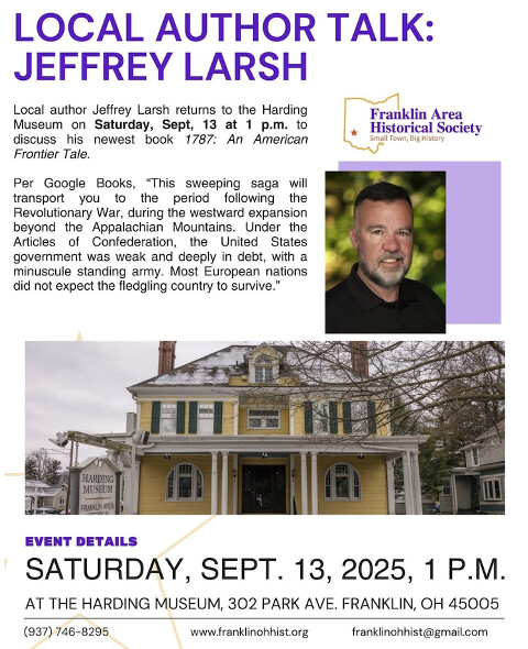 History came alive for attendees at the Franklin Area Historical Society, on Saturday September 13, 2025. Local author and historian Jeffery Charles Larsh gave a talk about his newest book 1787 and traced his family’s remarkable journey from French Canada to the Ohio frontier. Larsh, a military veteran and retired law enforcement officer, has written three historical novels inspired by his ancestor Paul Larsh (originally Larshvik), a French-Canadian fur trader whose adventures spanned thousands of miles and multiple wars.