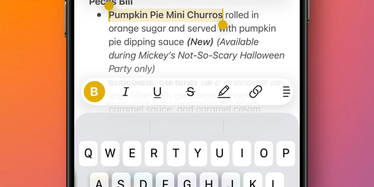 Apple Notes gains an Adaptive Toolbar in iOS 26 that changes based on what you are doing inside a note. When editing text, formatting tools such as bold, italics, underline, and highlight appear automatically. Selecting multiple lines brings up list controls, indentation, and block quote options.