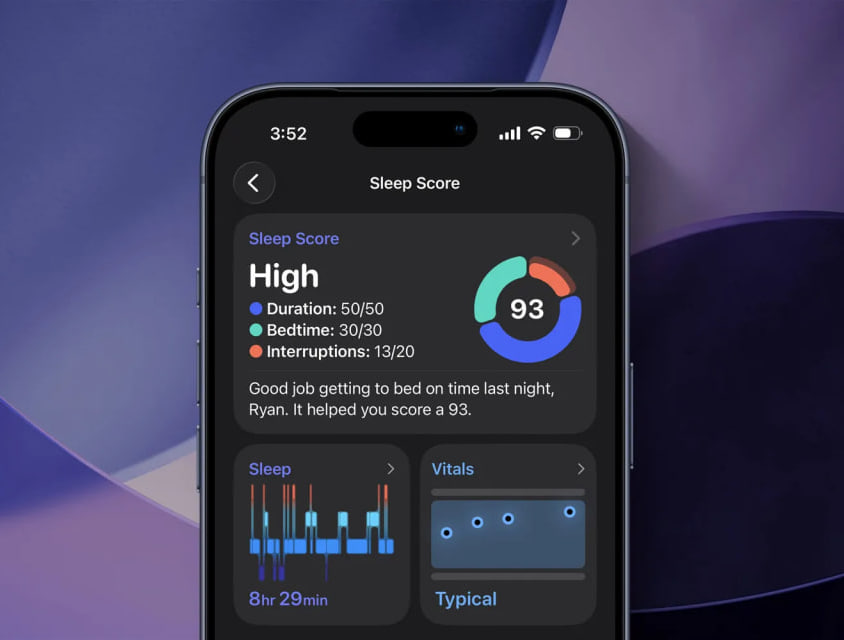 The breakdown makes it easy to see why a score is higher or lower on a given day. The presentation mirrors the simplicity of Activity rings on Apple Watch, making sleep data easier to check at a glance.