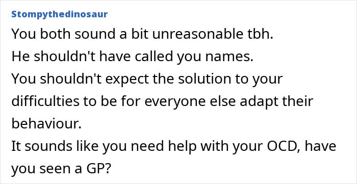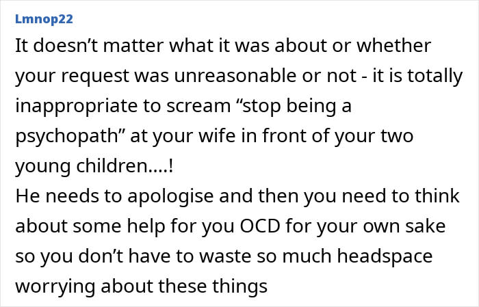 Netizens acknowledged that the husband’s reaction was inappropriate, particularly shouting in front of the children. At the same time, they pointed out that the OP’s strict hygiene rules and OCD behaviors were also contributing to the tension. Who do you think is more at fault here? The OP for her hygiene rules or her husband for losing his temper? We would love to know your thoughts!