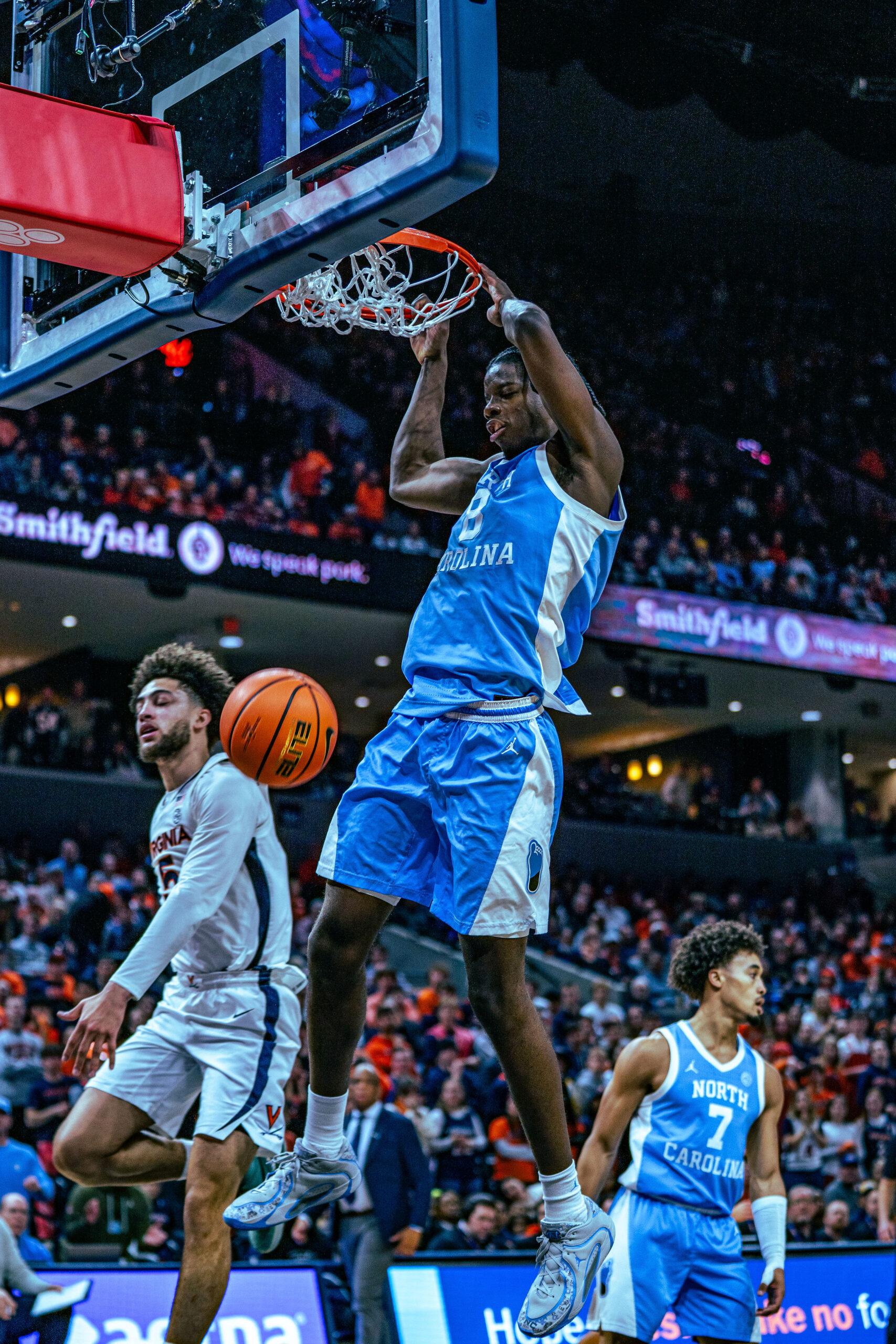 Caleb Wilson finishes a dunk during the second half of UNC’s game vs. Virginia. The Tar Heels fast-break offense helped Carolina pull ahead and keep its lead against the Cavaliers. (Photo by Chance Bragg/Chapel Hill Media Group.)