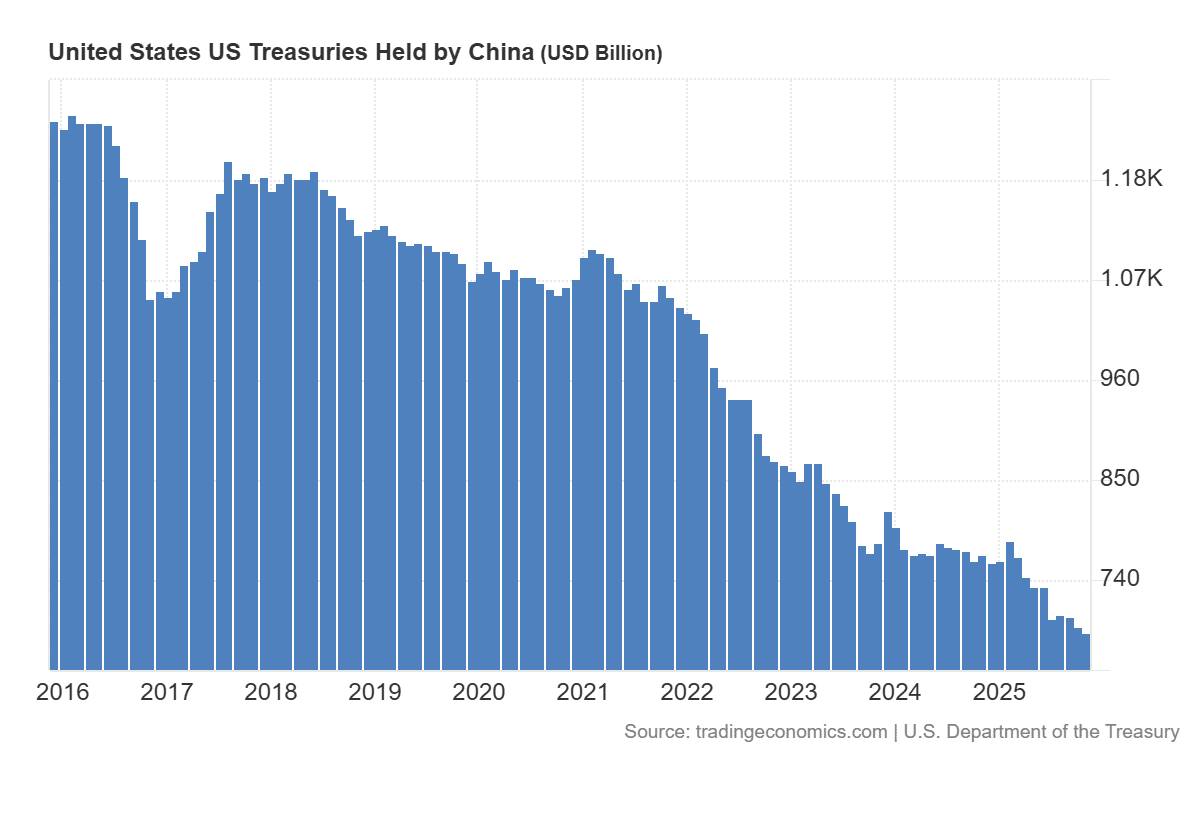 Against this backdrop, it’s not surprising that China appears to be acting early to limit broader fallout, with its U.S Treasury holdings falling to an 18-year low of $686.6 billion in November 2025.